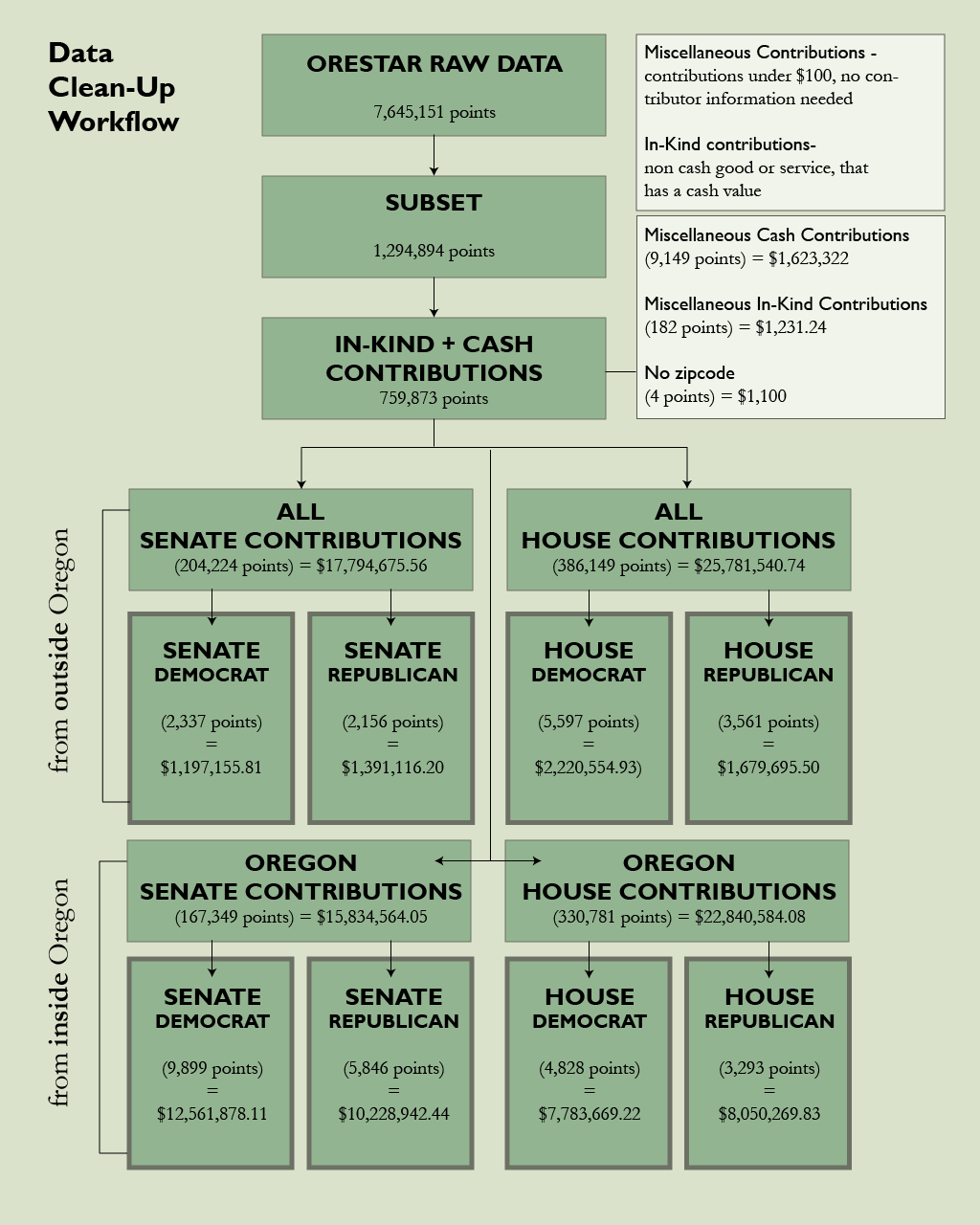 This project spatially looked at Oregon campaign contributions from the 2020 primary election for data scientist, Daniel Morris to show the spatial distribution of these data, as it pertained to subsets of the House and Senate, and Democratic and Republican parties. The original 7.6 million point dataset was cleaned up in Excel using pivot tables and filters. Analysis, cartography, and design was completed using Adobe Illustrator, ArcPro, and Excel (Visual Basic).